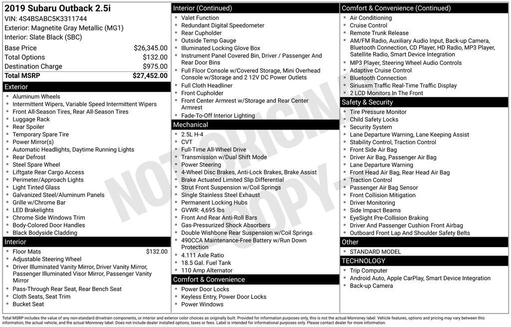 Check out this 2019 Subaru Outback 2.5i in sleek Magnetite Gray Metallic with a Slate Black interior. This versatile and reliable SUV is equipped with Apple CarPlay and Android Auto, a rearview camera, and a trailer hitch for added capability. Drive with confidence thanks to advanced safety features like lane departure warning, lane keep assist, and adaptive cruise control. Known for its durability and all-weather performance, this Outback is perfect for daily driving or weekend adventures.